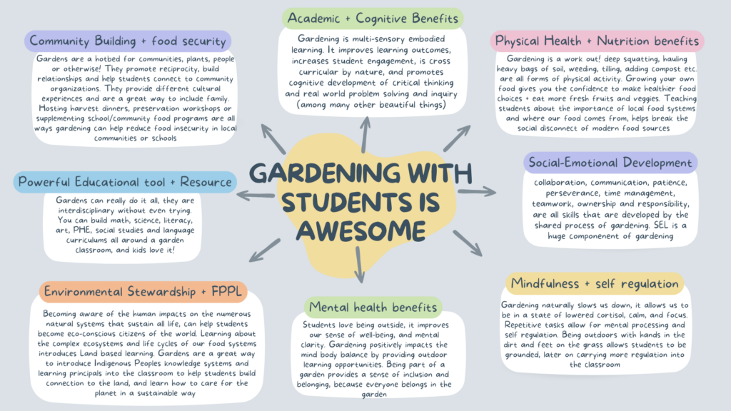 Beyond the academic benefits, gardening also helps children grow socially and emotionally. How, you might ask? School gardens can boost studentsâ attitudes, confidence, and motivation by giving them something they can take pride in. Being part of a garden encourages teamwork, brings students together, and creates endless opportunities for new friendships to form (some of my closest friends are the ones who help me weed and harvest!). Gardening also promotes mindfulness and helps students manage their emotions. The calm, repetitive nature of gardening like weeding, planting seeds, or watering, slows the mind down and gives students time to think, reflect, and work through any worries. We all know getting outside makes us feel better, but I wanted to understand why. Can gardening really support studentsâ social-emotional growth and overall well-being? Spoiler alert: it sure can!
