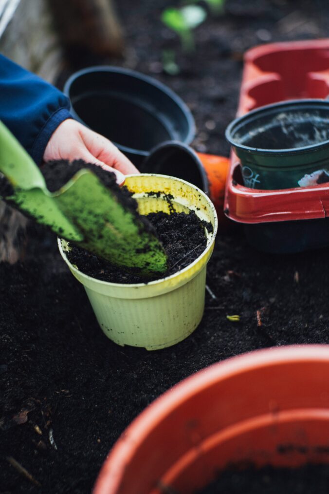 Saturate the soil: Show your kids how to dampen the soil before filling containers. It should be saturated before you put it into containers, I like to fill a wheelbarrow and turn the hose on and just mix it all together before I pot, bonus you feel like a witch stirring a potion!